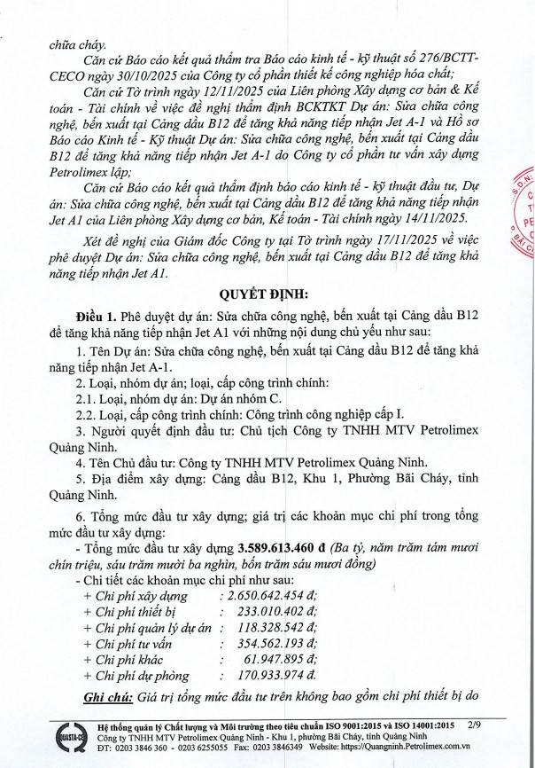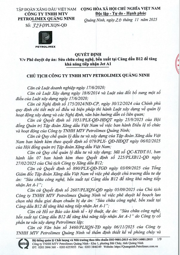 Quyết định phê duyệt dự án "Sửa chữa công nghệ, bến xuất tại Cảng dầu B12 để tăng khả năng tiếp nhận Jet A-1