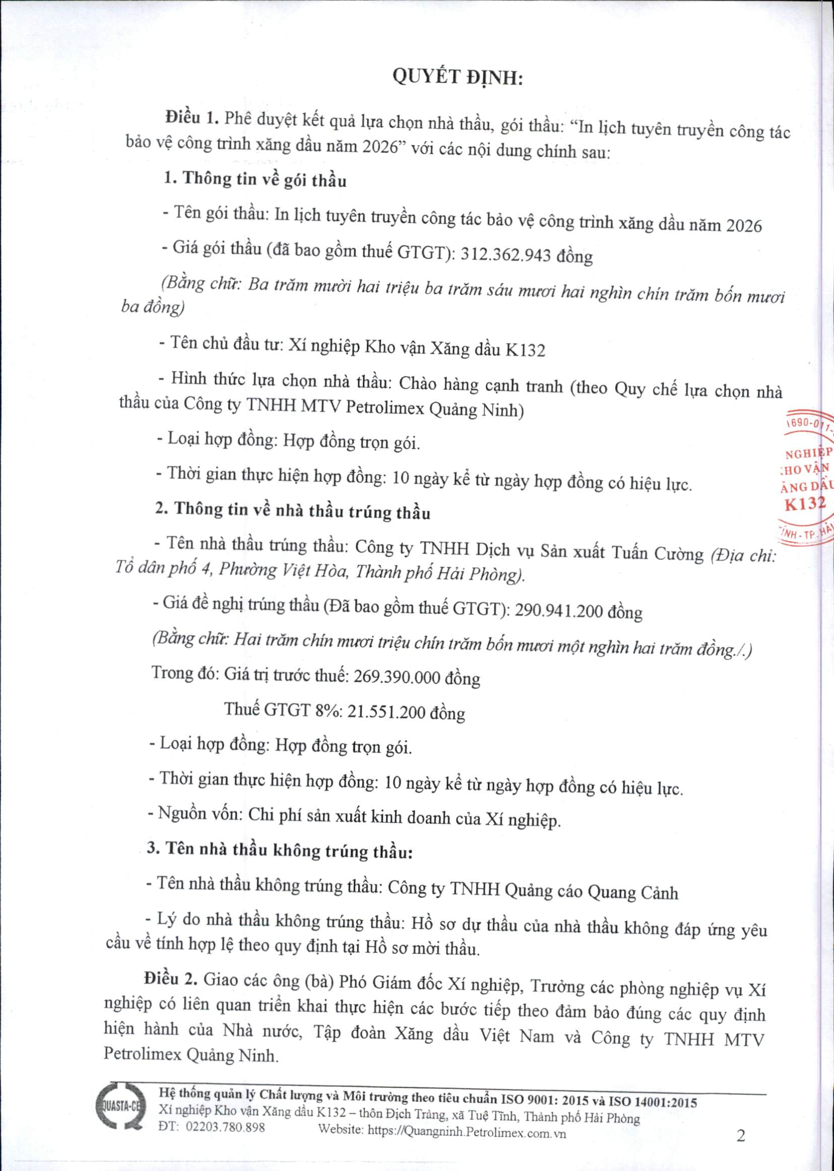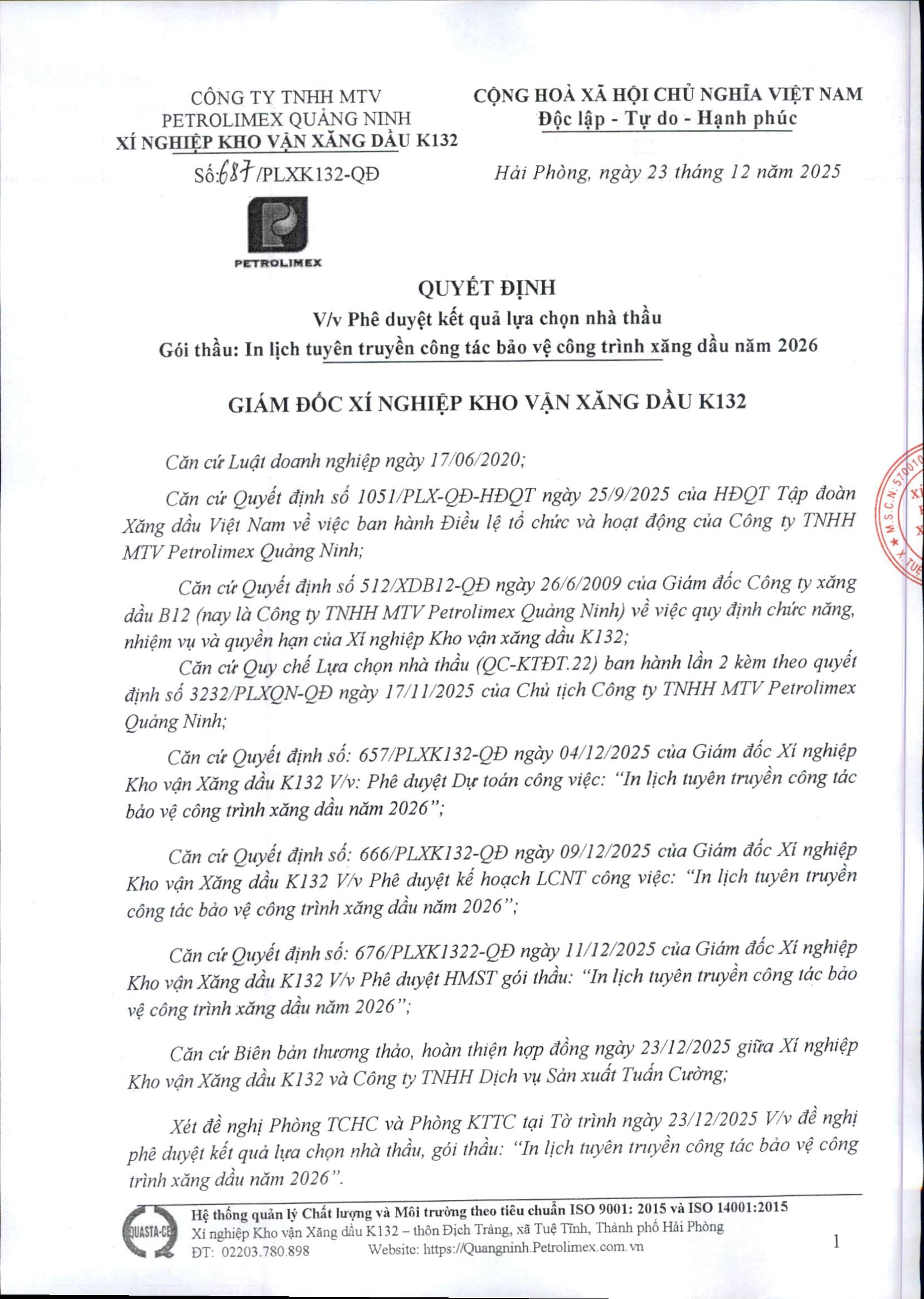 Quyết định phê duyệt kết quả LCNT gói thầu: In lịch tuyên truyền công tác bảo vệ công trình xăng dầu năm 2026