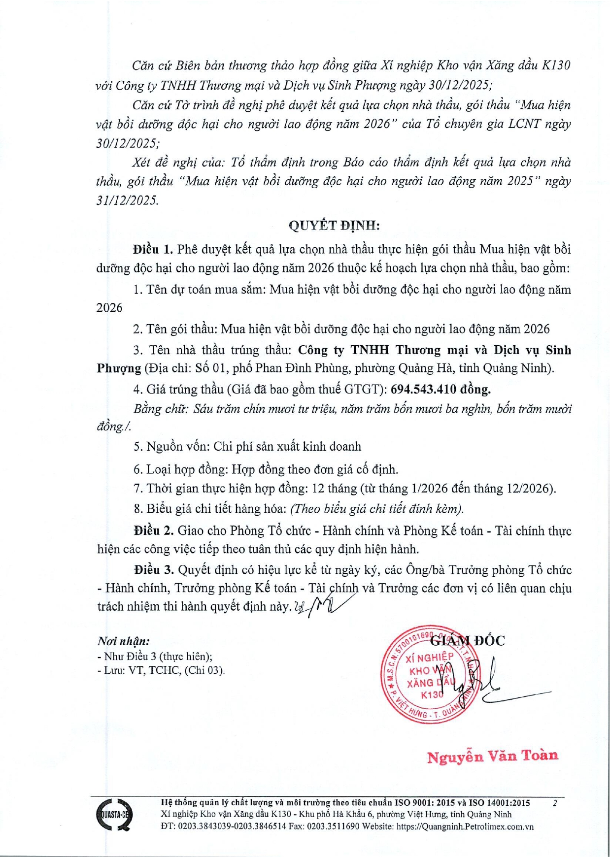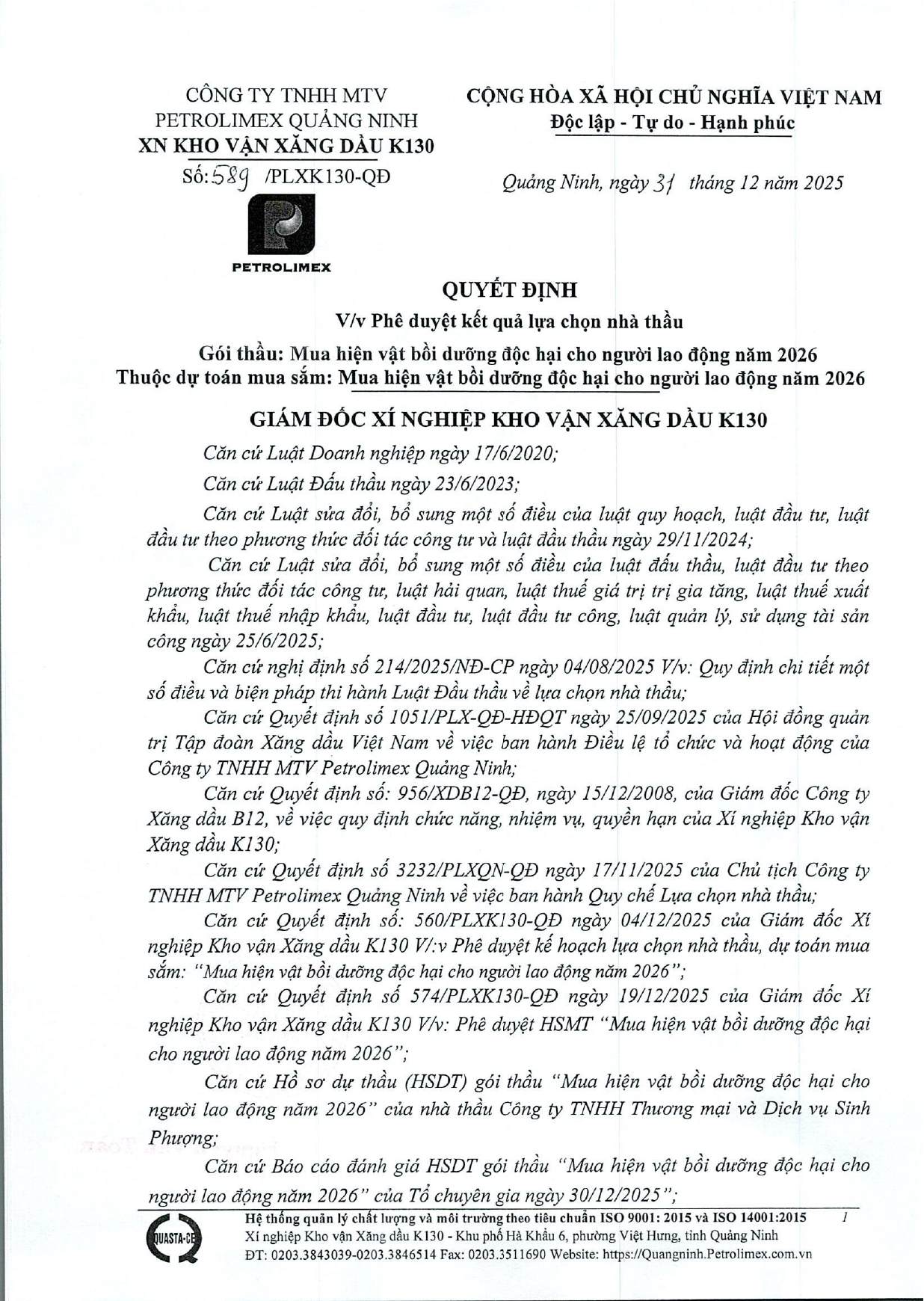 Xí nghiệp Kho vận Xăng dầu K130 thông báo Quyết định phê duyệt kết quả lựa chọn nhà thầu, gói thầu Mua hiện vật bồi dưỡng độc hại cho người lao động năm 2026