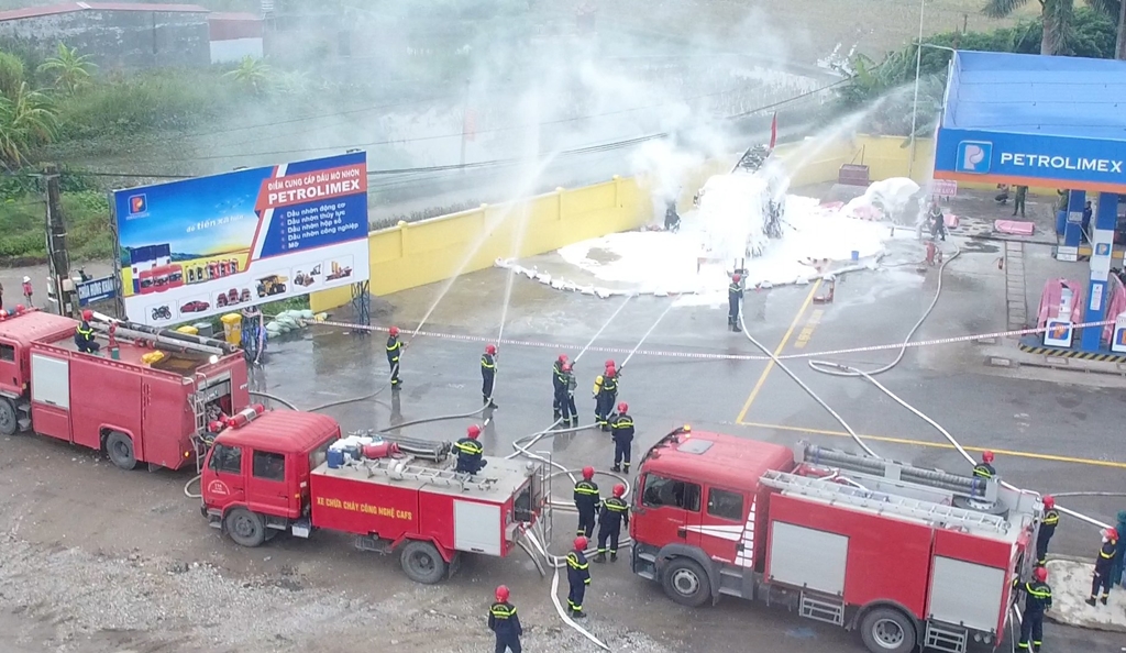 Tình huống giả định đưa ralà tình huống chữa cháy phức tạp nhất của phương án chữa cháy cơ sở đã được Phòng PC 07 phê duyệt, cụ thể là:Trong quá trình nhập hàng đã bị tuột khớp nối tại họng xả của ô tô xi téc và sự cố van xả nên không khoá chặt cô lập được xăng dầu từ xi téc chảy ra. Lực lượng cơ sở đã triển khai kế hoạch ứng phó sự cố tràn dầu. Tuy nhiên trong quá trình triển khai, do sơ suất bất cẩn đã gây ra cháy khu vực sự cố tràn dầu và ô tô xi téc. Khi phát hiện cháy, lực lượng chữa cháy cơ sở đã nhanh chóng thực hiện các biện pháp chữa cháy ban đầu, đồng thời thông báo ngay cho lãnh đạo Chi nhánh, các lực lượng chữa cháy chuyên nghiệp, chính quyền địa phương sở tại và các cửa hàng xăng dầu trực thuộc Chi nhánh trên địa bàn. Sau khi nhận được tin báo, các lực lượng đã có mặt kịp thời để hỗ trợ chữa cháy.Lực lượng PCCC&CNCH đã điều động 06 xe gồm 01 xe chỉ huy, 01 xe cứu thương và 04 xe chữa cháy cùng các cán bộ, chiến sĩ và nhiều thiết bị khác đến hiện trường dập tắt đám cháy và sơ cứu người bị nạn. Nhờ tích cực triển khai các phương án chữa cháy và CNCH, sau hơn 10 phút, lực lượng chức năng đã dập tắt đám cháy, ứng cứu kịp thời những người bị thương và bị mắc kẹt trong khu vực cháy, hạn chế thấp nhất thiệt hại về tài sản.