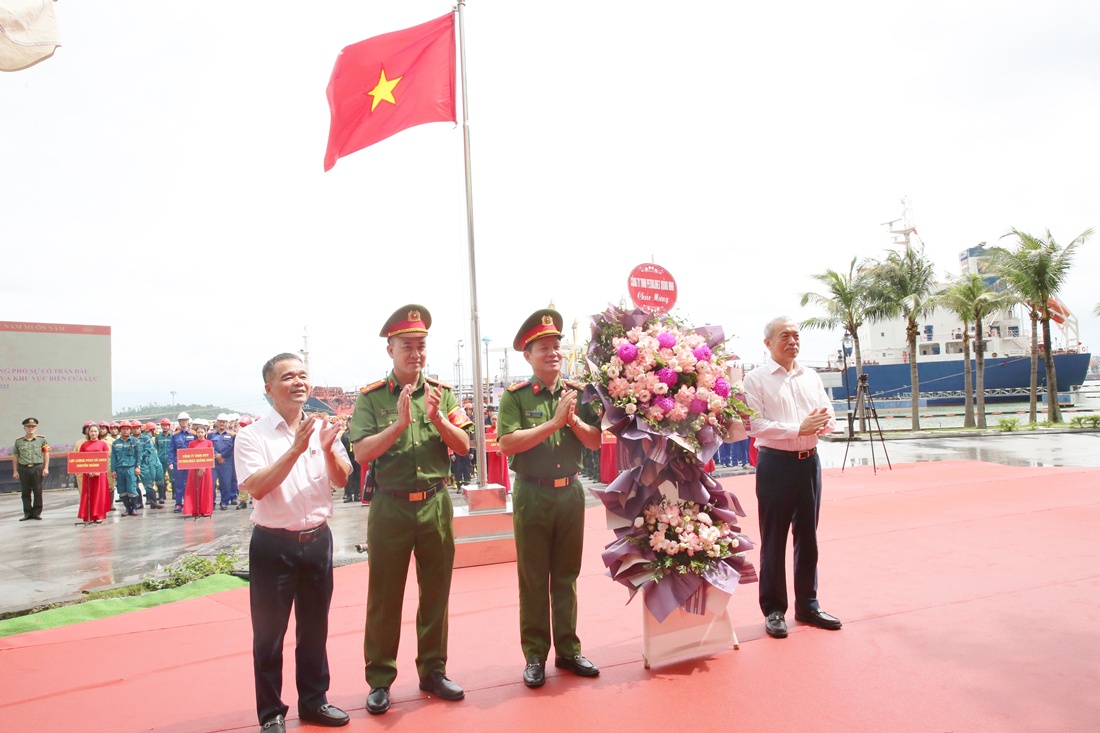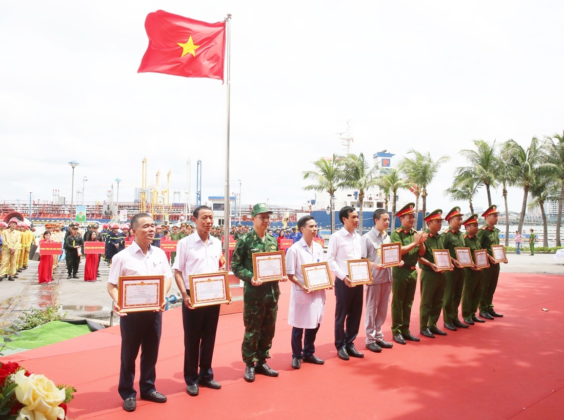 Các đồng chí đại biểu tham dự khai mạc Diễn tập phương án chữa cháy, CNCH và ƯPSCTD quy mô cấp tỉnh diễn ra tại Cảng dầu B12 và khu vực biển Cửa Lục