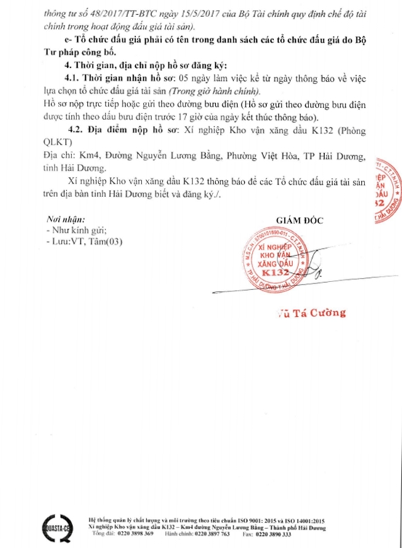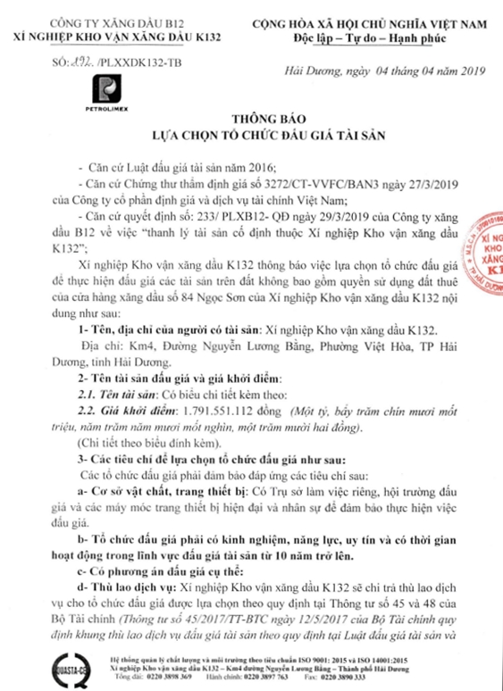 Xí nghiệp Kho vận Xăng dầu K132 thông báo việc lựa chọn tổ chức đấu giá để thực hiện đấu giá các tài sản trên đất không bao gồm quyền sử dụng đất thuê của Cửa hàng Xăng dầu số 84 Ngọc Sơn thuộc XN KVXD K132.