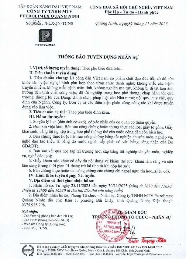 CÔNG TY TNHH MTV PETROLIMEX QUẢNG NINH THÔNG BÁO TUYỂN DỤNG NHÂN SỰ